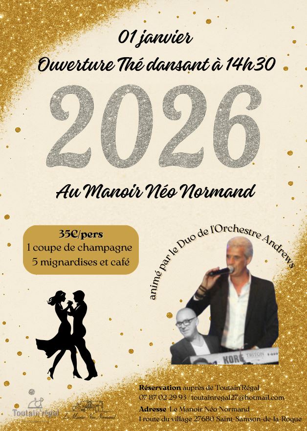 Thé dansant avec le duo de l’orchestre Andrews + coupe de champagne, mignardises et café.